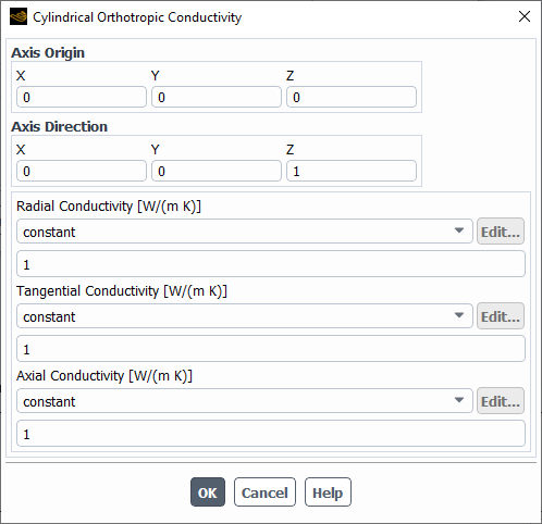 To define anisotropic thermal conductivity for a solid material, select anisotropic for Thermal Conductivity in the Create/Edit material dialog box.