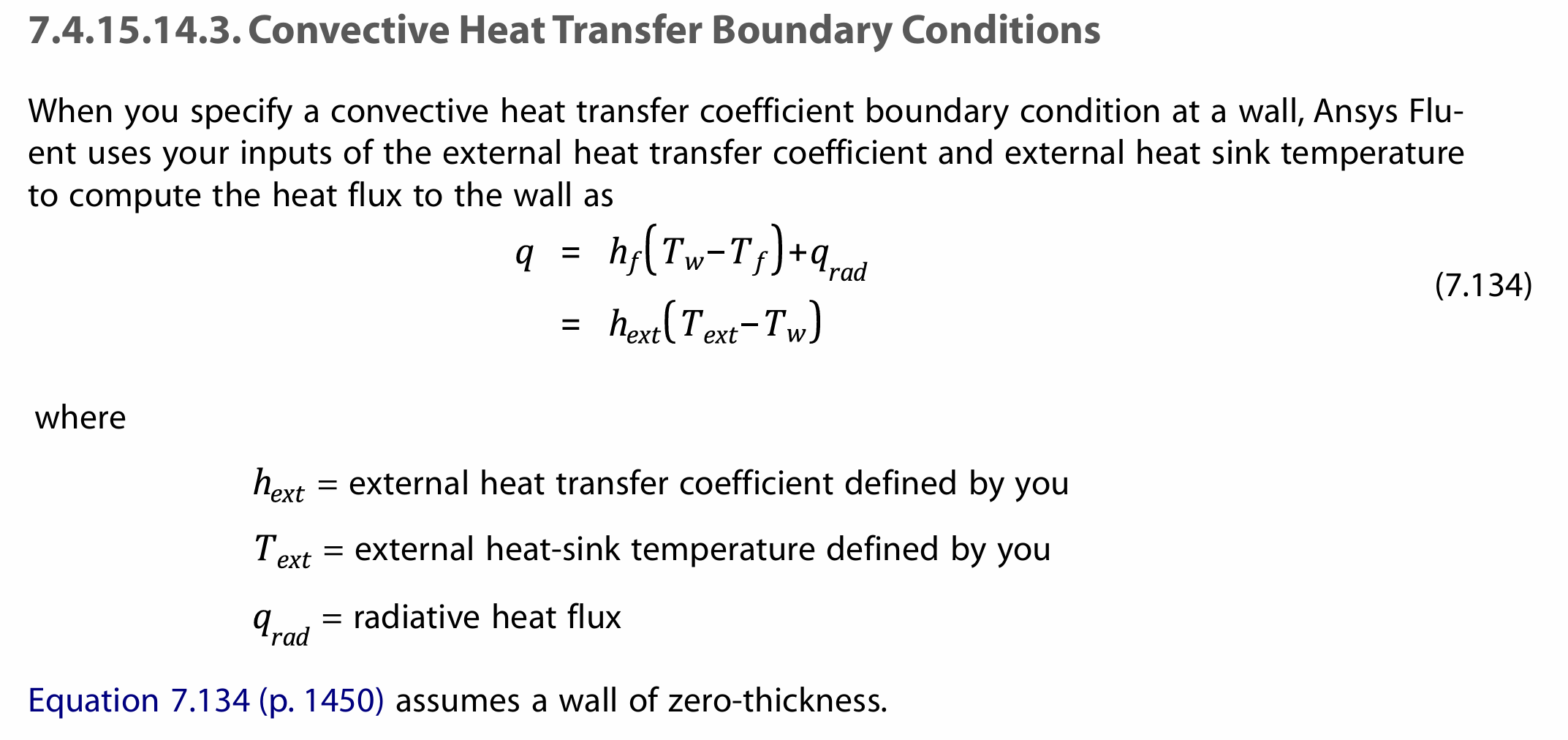 I am using ANSYS Fluent and have selected the convective thermal boundary condition. Is the free stream temperature mentioned in the set-up menu the same as T_ext (equation 7.134) in the User Guide? If not, what are the free stream temperature, T_ext and T_f?