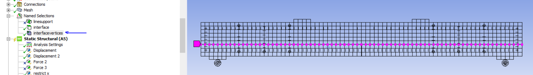 My problem is that I know how to add apdl commands to change the material properties of the beam however I am lost at how to assign interface elements. I tried making a named selection of all the vertices where the 2 layers meet and I was thinking of how I could define the interface material.
