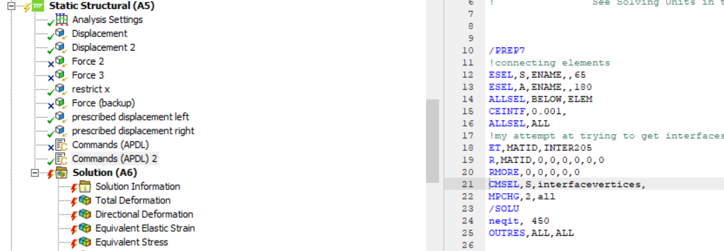I was thinking of using INTER205 (as my model is made of 3D solids). If anyone could please explain how to do this or provide an example of apdl code on how to assign INTER205 or a similar type of element to the interface between 2 layers I woud really appreciate it. I have been searching for a long time without any results.