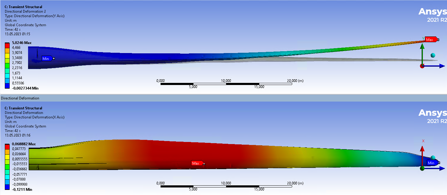 I am working with the transient simulation of a wind turbine blade. I tried to plot the directional deformation of my model in different directions (seen in the attached figure). The load I applied has all three components. My question is, when I plot directional deformation in the x direction, it shows a minimum at the tip location (which is not the case for the cantilever) rather than at the blade's root. What may be the reason for having such a deformation plot?