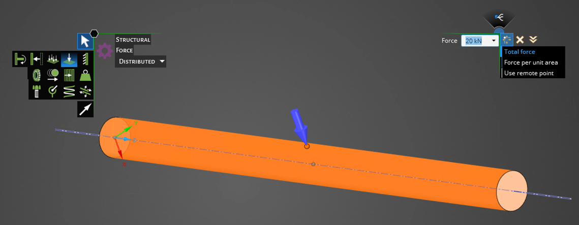 When you apply a structural load like Force in Ansys Discovery, by default it gets distributed across the scoped geometry. Thus, when a distributed load is used, it resembles a force per unit area.Â