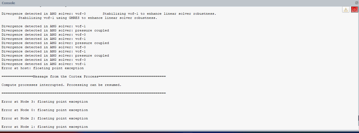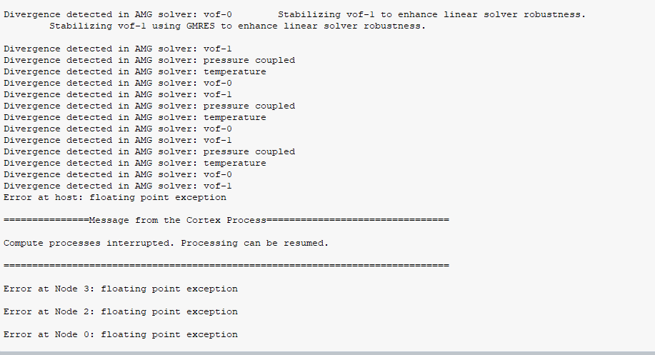 Furthermore, I have performed the simulation by disabling the surface tension force modeling. In this case no divergence issues appeared until a certain point, however afterwards the same error has appeared. Please find below. Thank you in advance your suggestion/help.