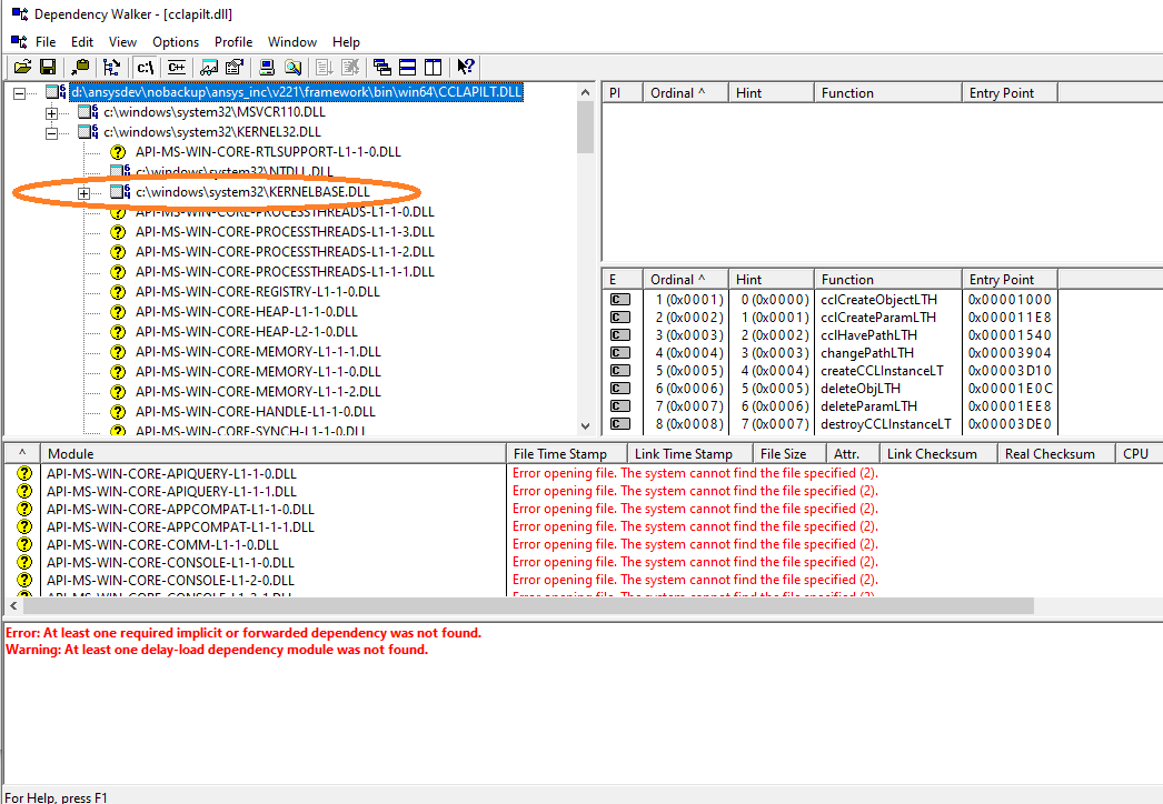 You can find out more about missing dependencies, using, for instance,a free dependency check tool called Dependency Walker (http://www.dependencywalker.com/). Simply download and run it, click File->Open and select the cclapilt.dll from ANSYS installation, the dependencies will be shown as in the screenshot below. If KERNELBASE.DLL is missing, it will be marked with a question mark. You can see that this file exists on my computer under C:\Windows\System32\.