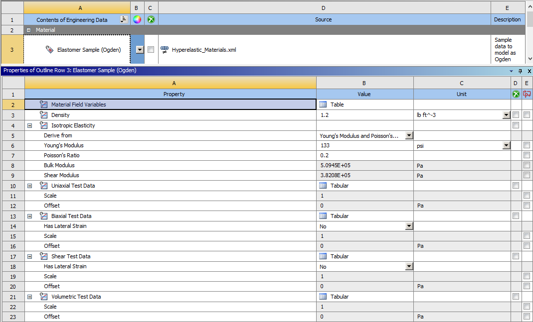 My goal at this point is to get any soft foam type modelto work and polish it from there. Therefore, I added a hyperelastic (Ogden model from the engineering database on Ansys). In order to run the analysis with the default Ogden material I had to add an isotropic elasticity to the model. For this I input the Young's modulus and Poisson's ratio from the article that you linked. Howevee, now I am getting a new error "time step too small". Are there any obvious reasons you know of that would be cauing this error? I have attached some screenshots of my new defined material.
