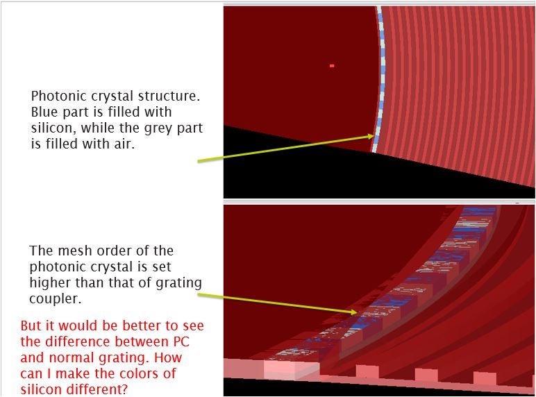 However, I cannot just modify the colour of the material inside the photonic crystal. If I change the colour of the silicon in the library, the whole silicon structure would change at the same time. So I will not be able to see the difference between the normal grating coupler and the additional photonic crystal.