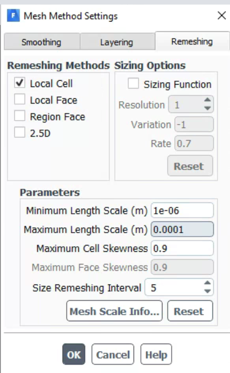 Subscribernthank you for your message. below is the setting I have considered for remeshing:nnnnwith the above setting, it took about 20 hours (100% CPU usage) to proceed 57 timesteps and Fluent crashed at some point. (it was remeshing)nwithout activating Local cell, preview mesh motion proceed up to 46 timesteps in few minutes and it fails with negative cell volume (I could not see any remeshing)nnMy question is why by activating Local Cell Fluent becomes incredibly slow and CPU usage goes up to 100%? (and without activating local cell it seems no remeshing happens)nnand by small timesteps, I mean leaflet displacement at each timestep is very small compared to the mesh element size. below is the fluid domain mesh and moving leaflet (moving wall):nn