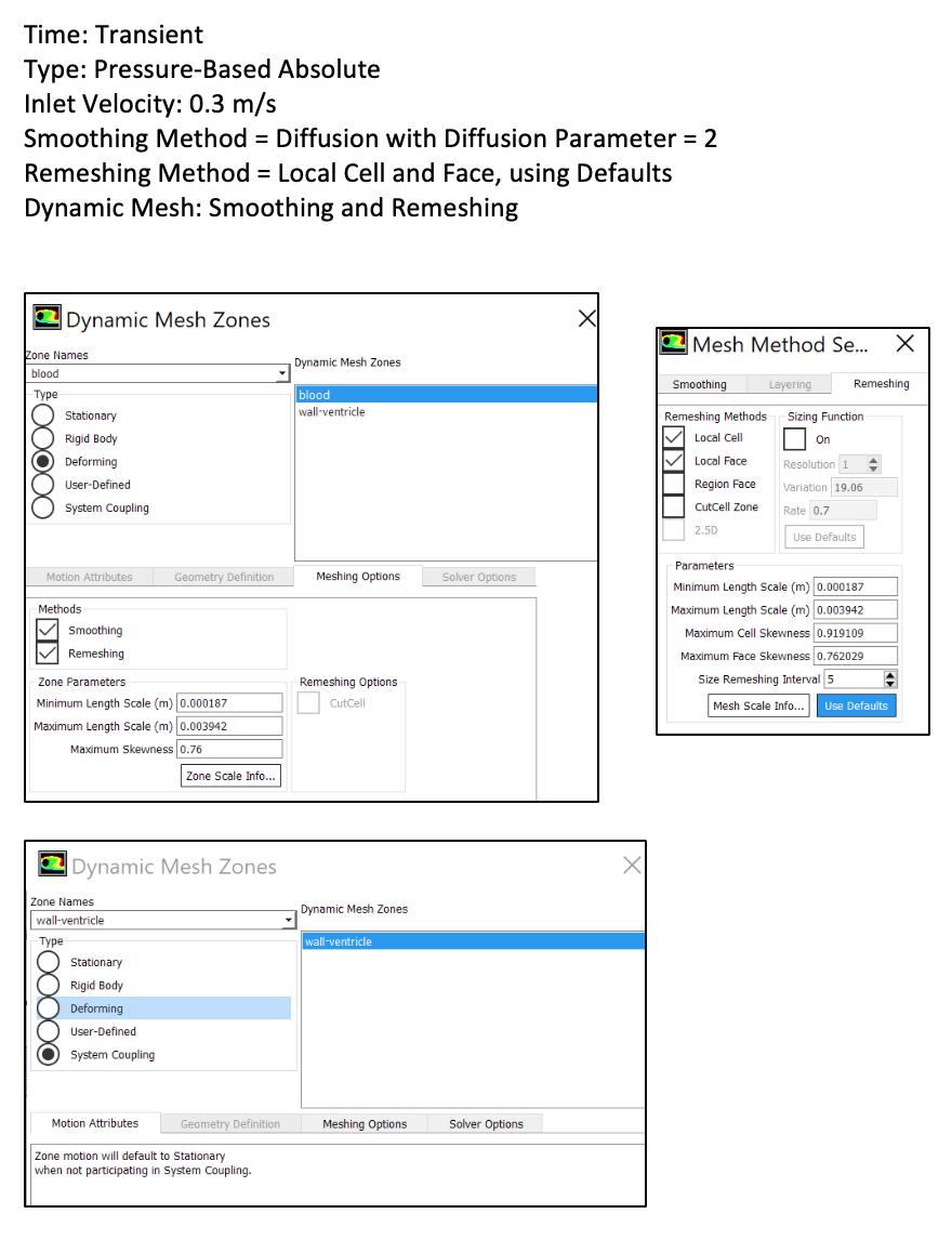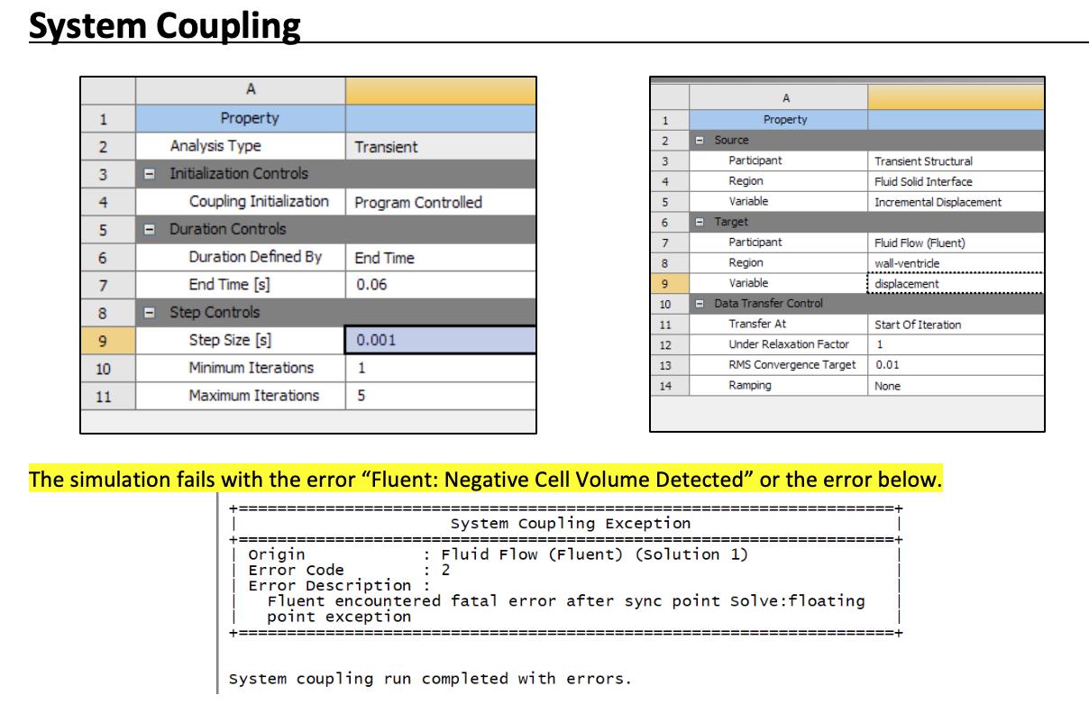 SubscriberI am trying to simulate a moving heart with an implanted device using both fluent and mechanical as a fluid-structure interface simulation (i.e. passing imported displacements from mechanical to fluent). The mechanical simulation works as expected, but the fluent simulation fails (floating point exception and negative cell error).