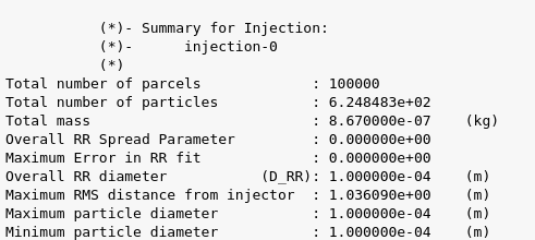 Hi- i have attached the picture of summary injection. There the ‘total number of particles’ is per injection point right? Time step=0.0005 and time=0.5 s. Also to have a very low vol. fraction(1e-6) in a long pipe, i need to keep the number of particles/parcel <1 with 100 parcels/time step. Is it technically accurate to keep < 1 particle per parcel because normally number of particles>no of parcels.