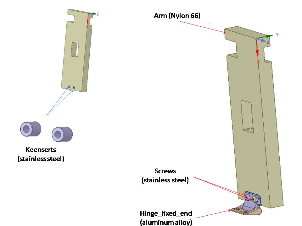 The attached para solid file is a jig (1/3rd of the full geometry). It has a torque hinge (aluminum alloy) joined to the vertical arm (nylon 66 30% glass filled). The forward and reverse torque values for the hinge are 14 in-lbf and 24 in-lbf respectively. The two screws holding the hinge are made of stainless steel. The arm also has two Keenserts made of stainless steel.