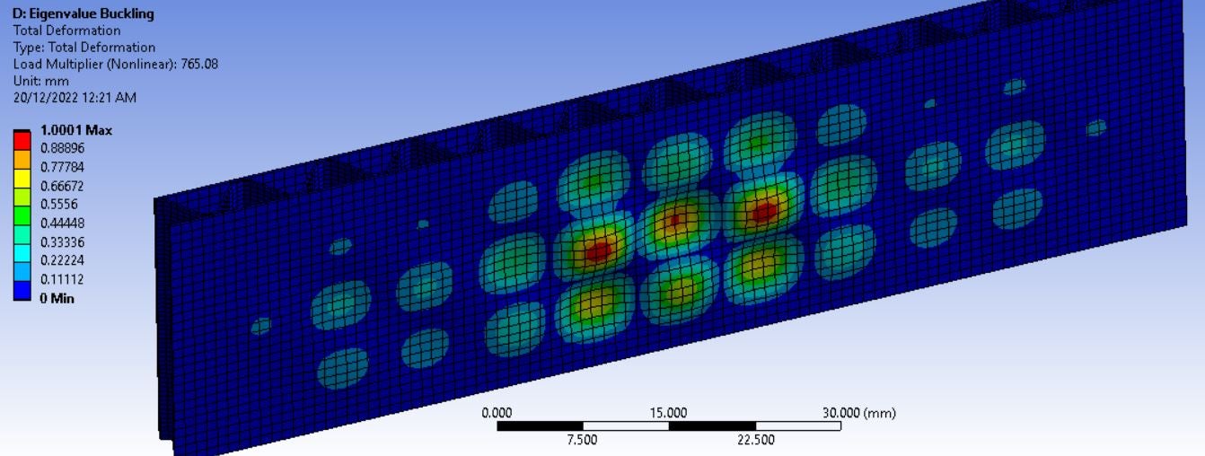My model is a 3-layered sandwich structure of orthotropic material. I have defined element orientation to address the orthotropic properties (using shell elements). I’m using 1% of the first buckling mode of perfect geometry as the initial imperfection for the post-buckling analysis (image below is the full scale imperfection).