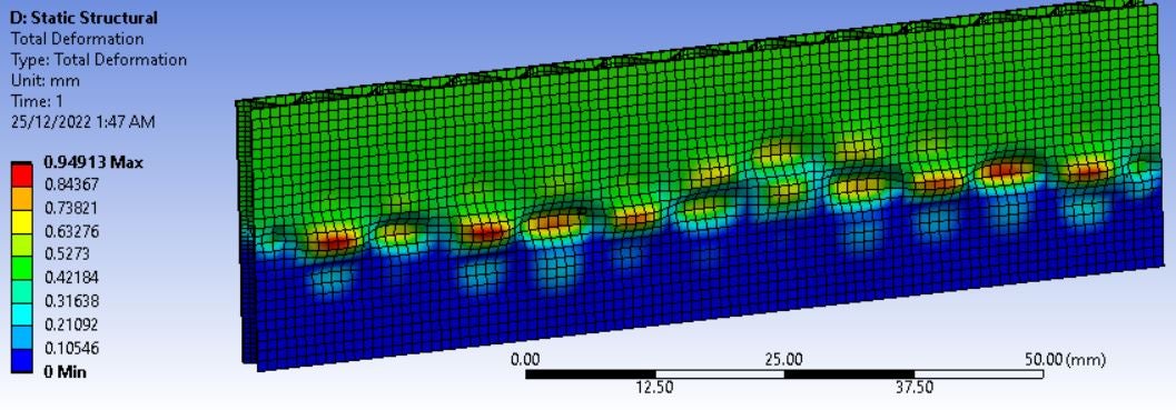 SubscriberReza, I recommend bringing the sheet bodies into SpaceClaim and using the Share button to cause the edges of the honeycomb core to imprint onto the facesheets. Then in Mechanical, the mesh will be connected between the core wall edges and the facesheets without using contact. This will result in a much cleaner simulation for ekill than using contact.