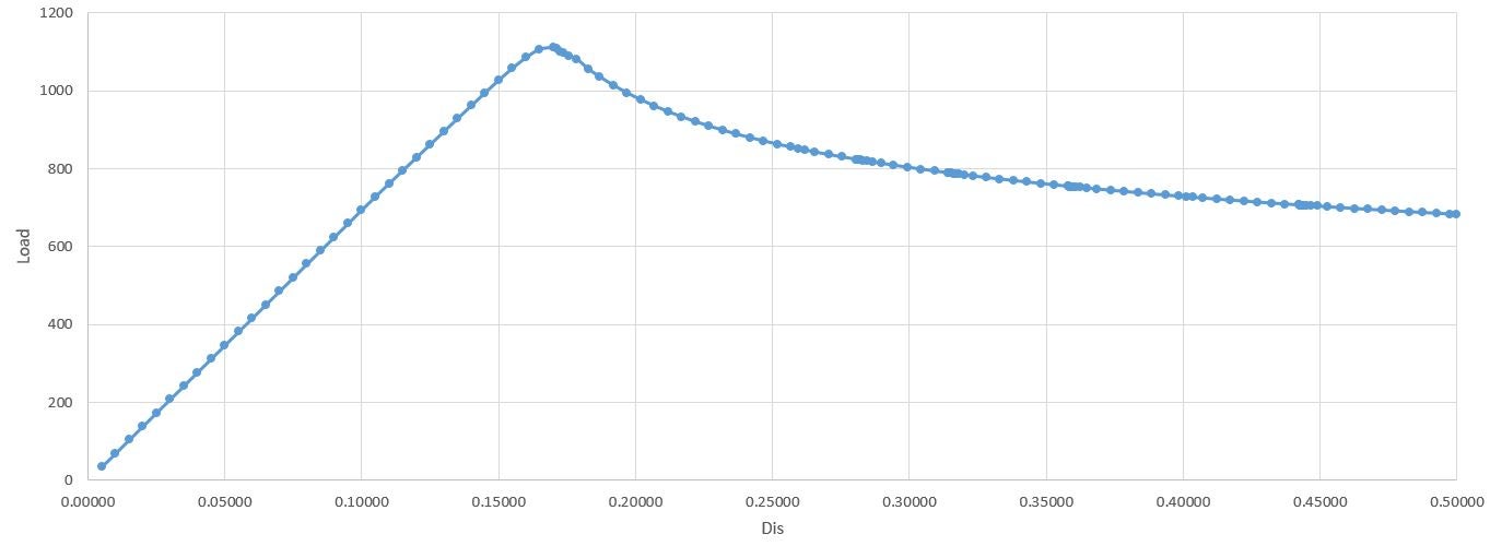 I tried applying kinematic hardening. My material is ortothropic, but I know the failure direction. So I use the compressive stress limit in that direction as the yield strength with 0 tangant modulus for bilinear kinematic hardening (as my case is monotonic loading, documentation says both isotropic and kinematic modes are the same). My solution now goes post-buckling (without exessive distortion) and load-displacement curve looks like this after 0.5mm total displacement: