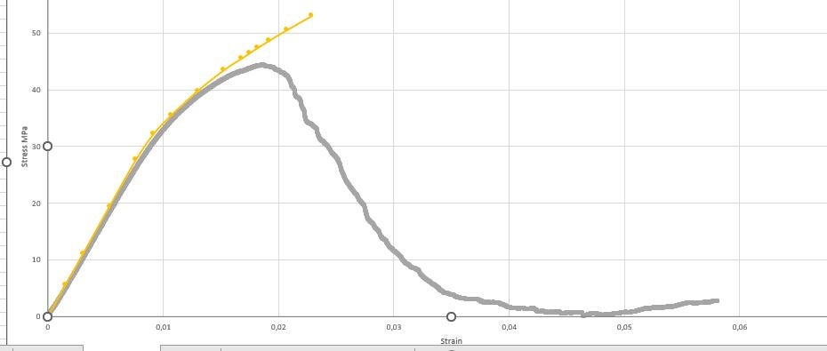 Thankyou for the reply, the yellow curve was traced, for the stress obtaining the reaction force at the base of the specimen divided by the area and the deformation as a change in length divided by the initial length