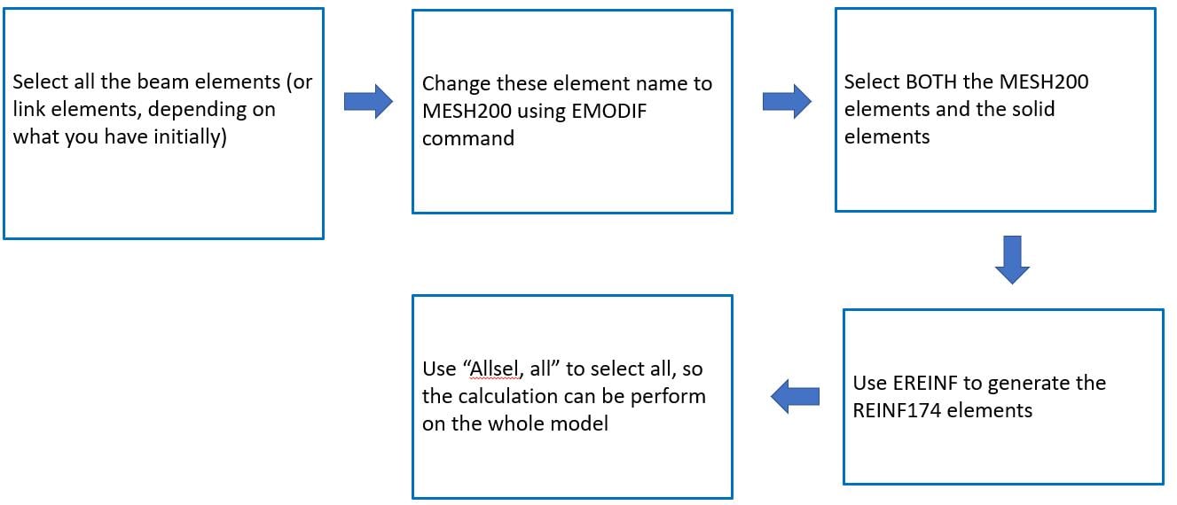 5. Use EREINF. It will generate reinforce elements REINF264 that connects your solid element at your previously defined link element location.Â