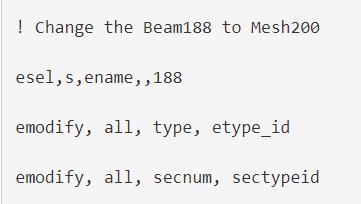 3. Use EMODIFÂ to change the beam elements' ename to MESH200