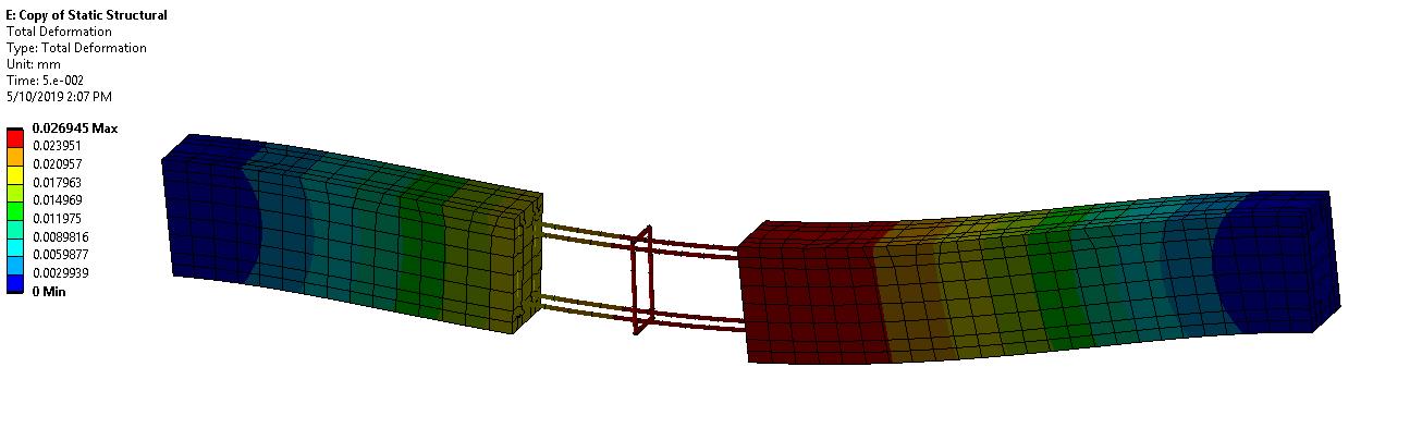 I am analyzing a reinforced concrete frame. The connection between the elements is made through a system formed by a screw and steel plate. The connection region is filled with grout, but for initial analysis, I suppress the grout. Taking the advantage of symmetry, I modeled just half of structure.