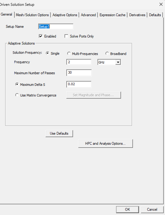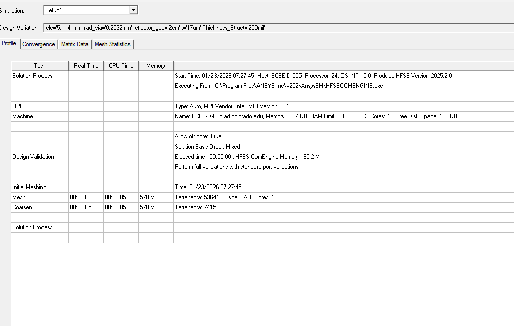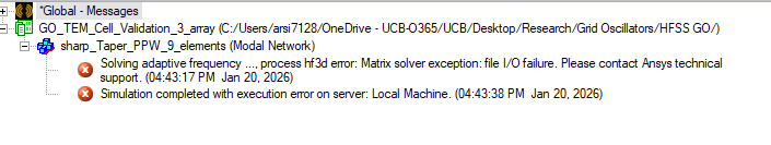 Ansys EmployeeThe profile image you attached is from the initial mesh analysis stage, not the adaptive analysis stage.ÂHowever, if you receive an I/O failure message, this indicates either insufficient memory for the analysis or an incorrect Temp folder location. Please refer to the profile shown when the adaptive analysis progressed and stopped with an error.Also, please check that the data size in the Temp folder, where data is temporarily saved, is not overwhelming your disk space.You can find the location of your Temp folder by selectingTools > Options > General Optionsand then selecting General > Directories > Temp from the Options window.Try deleting any files or folders in the Temp folder while HFSS is not running.ÂAlso, make sure you have access rights to the specified Temp folder.ÂAlso, consider changing the drive where the Temp folder is setto another drive with available space.To change the Temp Directory, check Override in the settings above and enter the folder path.When doing so, be sure to create a folder and specify that folder rather than specifying a directory directly under the drive.(For example, D:\temp)In addition, when setting the Temp folder, avoid a drive on a network; use a local drive on the analysis machine.
