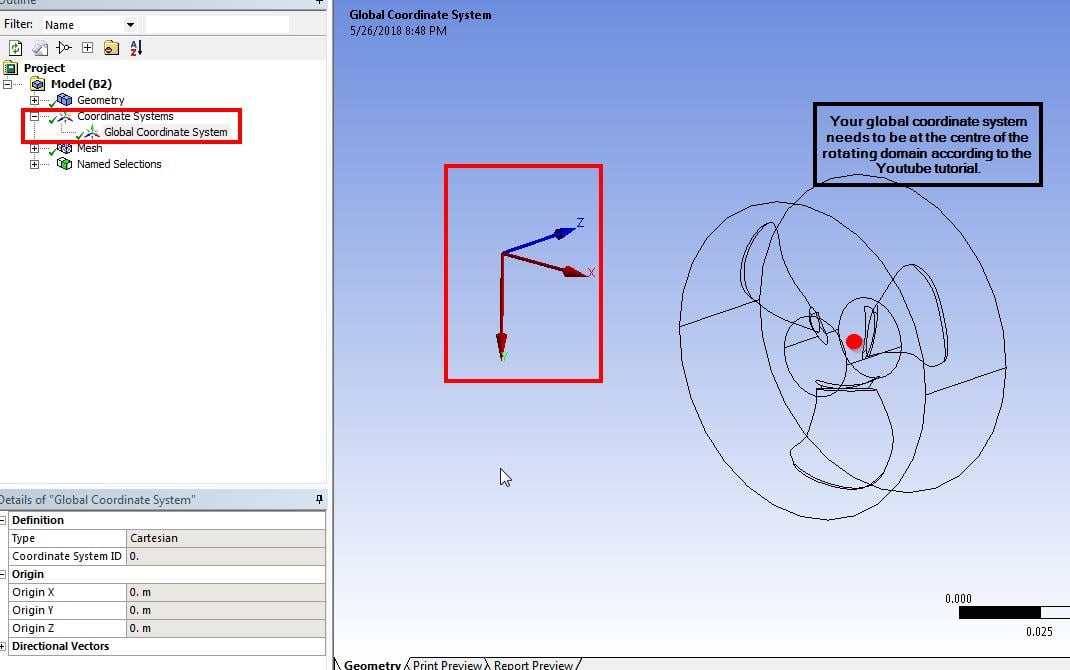 SubscriberDenis, I looked into your setup. Your global coordinate system is not located at the center of the rotating domain and since you were defining the rotation about the Global Z axis, you were getting the error. If you're just learning from this tutorial and don't want to go back to the geometry or mesh and fix the global coordinate system, you can follow the steps mentioned below that will help you fix the error and run the simulation. All you'll be doing is going to the CFX-Pre setup and defining a new coordinate system "Coord 1" which would be centered at the rotating domain. You'll then define the rotation w.r.t this new coordinate system. And your rotation speed (1500 rad/s) is really high compared to the value used in the tutorial (300 rev/min). So your timescale might be much smaller than that shown in the tutorial.