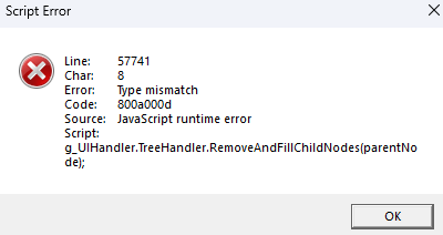 Script: g_UIHandler.TreeHandler.RemoveAndFillChildNodes(parentNode);A: Windows 11 24H2 has begun setting a local policy that, by default, causes applications to use the JScript9Legacy.dll instead of JScript.dll.