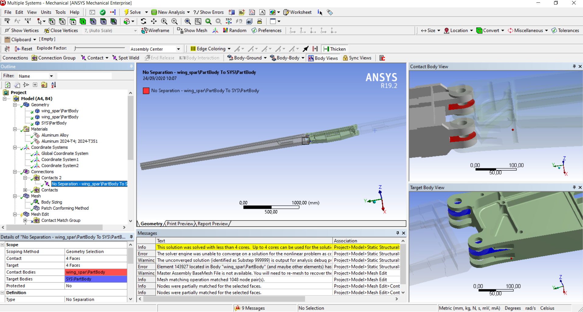 Ansys EmployeeHi,nDue to company policies, Ansys employees cannot download any attachments. Could you please insert some inline images showing your geometry, contacts (if any), the boundary conditions and loads you apply and the error messages you are getting?nThanks,nSain -