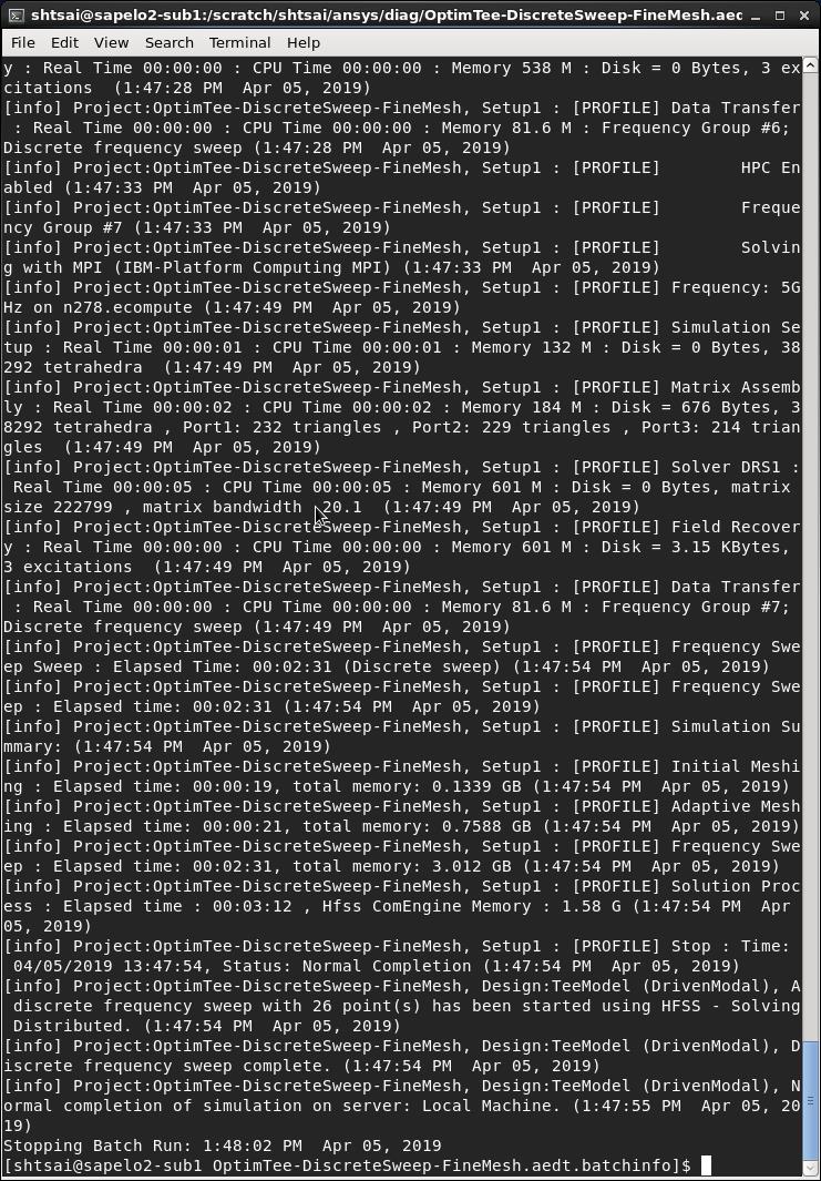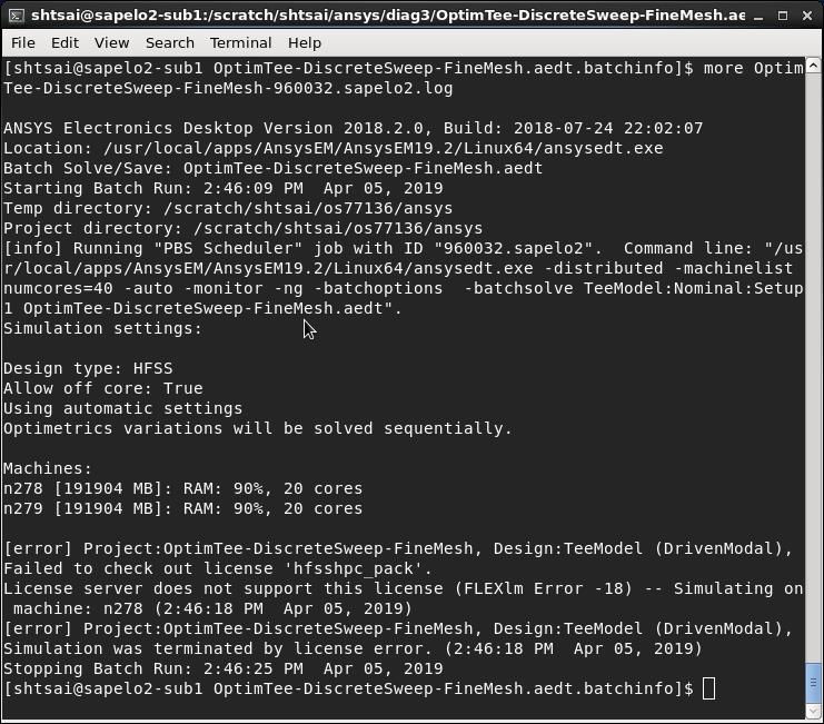 |usr|local|apps|AnsysEM19.2|Linux64|ansysedt -distributed -machinelist numcores=40 -auto -monitor -ng -batchoptions "" -batchsolve  TeeModel:Nominal:Setup1OptimTee-DiscreteSweep-FineMesh.aedt