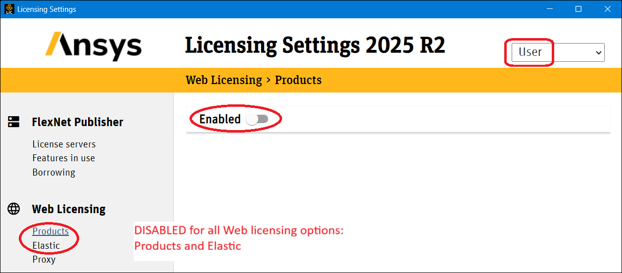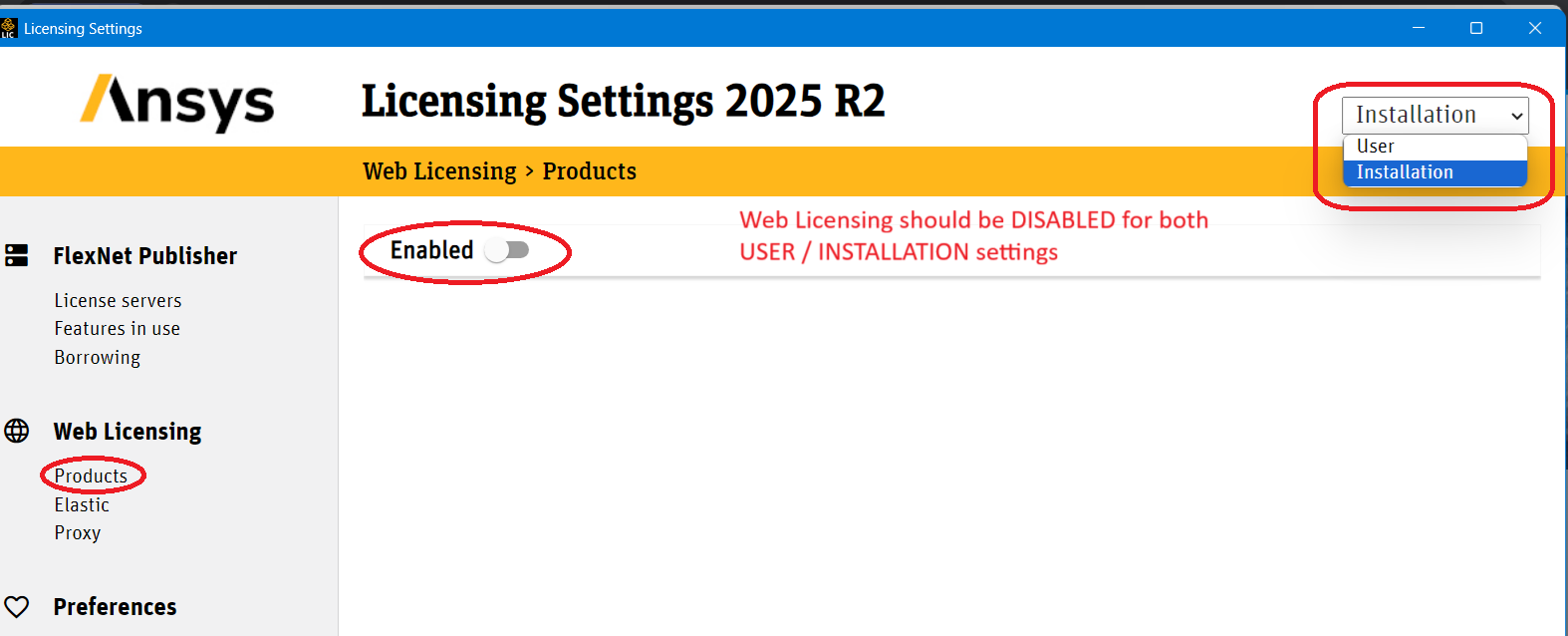 Ansys licensing settings – Web Licensing > Products & Elastic (Disabled for both USER & INSTALLATION)