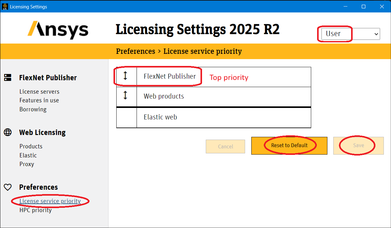 Ansys licensing settings – Preferences > License service priority (set for both USER & INSTALLATION)