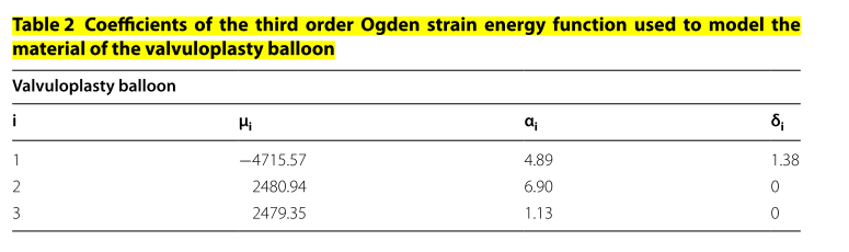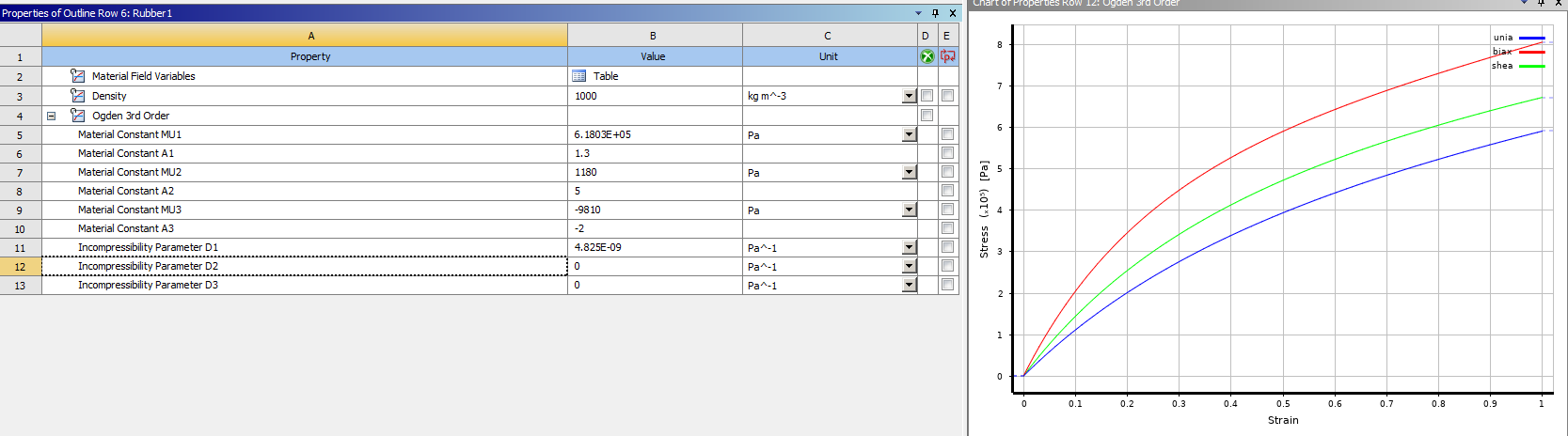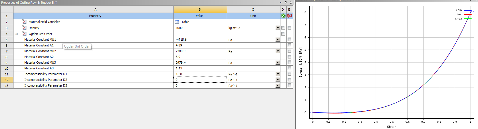 But I want to run the model with values from a paper I am referencing. The material properties are seen below. This is also a third order Ogden material.Â