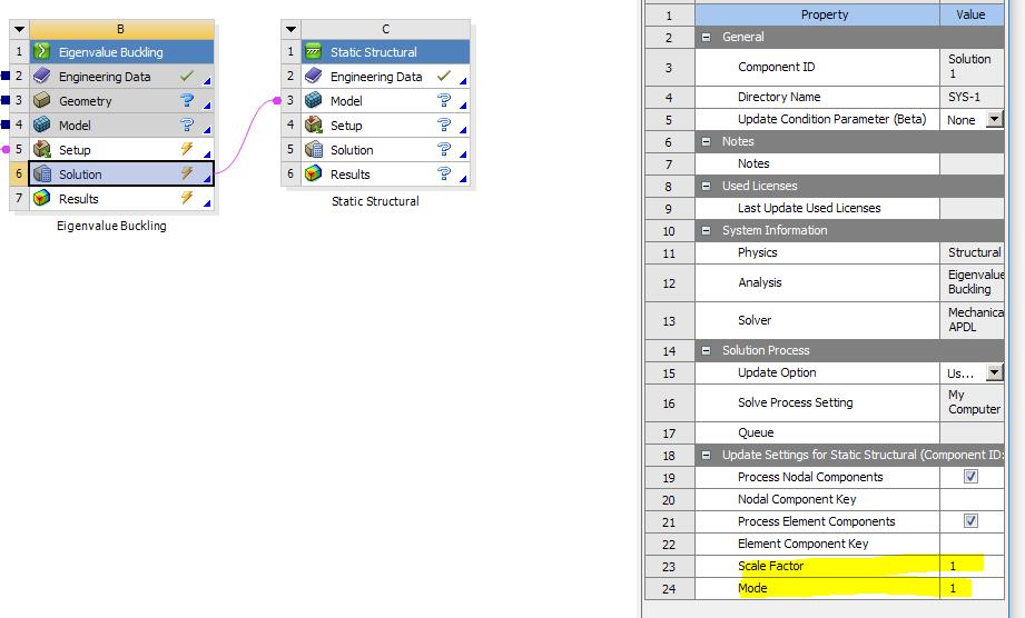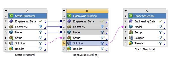 So, the new workflow for this would look like the below.  Run you eignenvalue buckling, but then pass the solution cell to the model cell of a new static structural that is setup for large deflection, etc. for the non-linear buckling.  This passes the deformed model to mechanical as the starting point for the non-linear buckling (stress free.