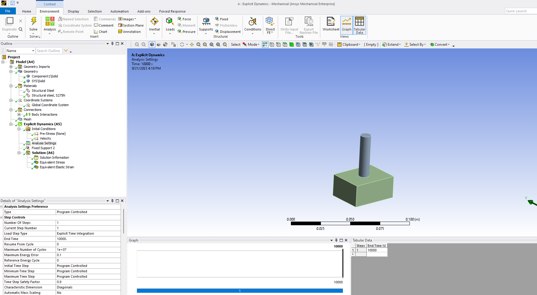 SubscriberHi, I am performing a study on a BOP ram, and I wanted to conduct an explicit Dynamics study to evaluate a certain operating condition. However, I entered all the required information successfully and I even didn't leave a space between the two bodies, I added the intial velocity, and all other information. However, the cycles number is always zero and there is no any recorded motion or any generated stresses of deformation! I thought that may be the problem that I imported the model from SW!! so I did a model on Discovery and also still the same problem. So, I performed the following simple example first to try to verify where is the problem and then I will apply the true steps on the actual model I have. I attached here below a screenshot from my model for your reference and in case somebdoy can advice me about what to do!Â