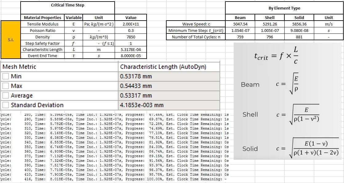 SubscriberAs the title mentions, I ran a simple model to test the stated process for creating a stable explicit time step as proposed by the Ansys Learning video. So in the model, all I did was create a simple 2x2x2mm Linear Hex of Structural Steel. Following the video for wave speed in a solid element, c = 5856.36 m/s . The characteristic length of this single undeformed element is described in the Explicit Analysis Guide as "The volume of the element divided by the square of the longest diagonal of the zone and scaled by (sqrt2)/3." Doing the math on that, the longest diagonal is the body diagonal of the cube, 3.464mm, and the characteristic length is then 0.3143mm. The mesh output plot, if set to "Characteristic Length (AutoDyn)" reads 0.54433mm. What is the discrepency here? If I run any model using this as my only element size (set to hard to fix its size), then program controlled gives me a time step increment in the post output. If I work back this time step by the CFL condition, the plotted characteristic length from Mesh Diagnostic does not actually give that time step. Also, the Analysis Setting of "Characteristic Dimension: Diagonal" (or any option) does not appear to change that mesh value. I understand that there may be more factors influencing the time step, such as contact, but the guidance for using CFL seems to not work either way. It seems like the best approach to getting a stable time step is to let ANSYS program control it, then take that number and reduce it as needed. I'm almost positive I have done the math right and checked units, but no matter how I try to work it, ANSYS usually gives around half of the CFL value as the initial program controlled time step.