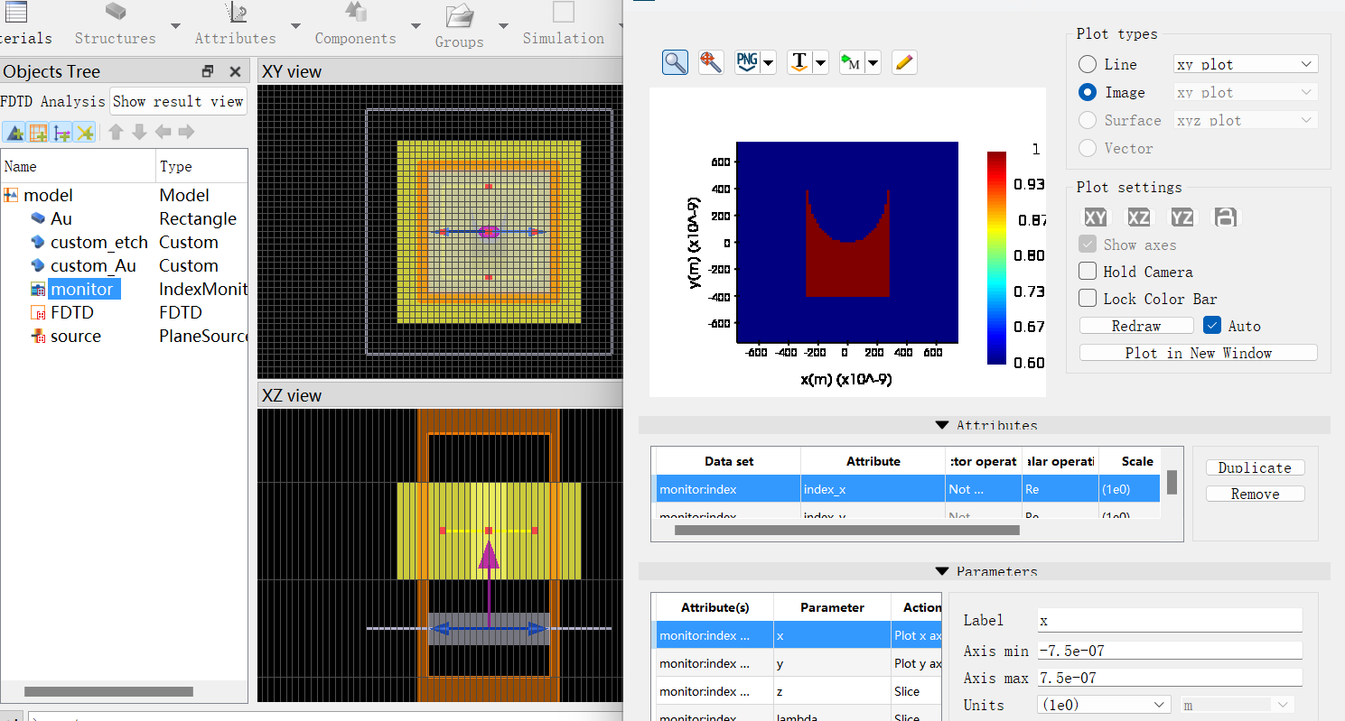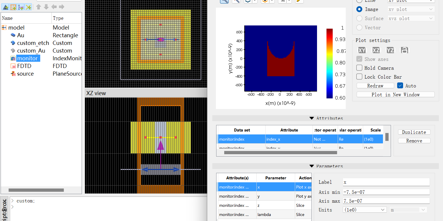 Ansys Employee你需要改Mesh Order。把金属改为3,第一个custom不要选取etch,而应该先空气折射率1,Mesh Order2,第二个custom选取了Au, Mesh Order 1。 再通过折射率监视器看看。参见