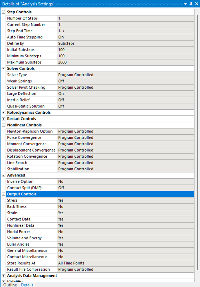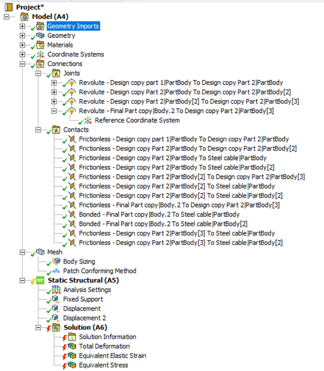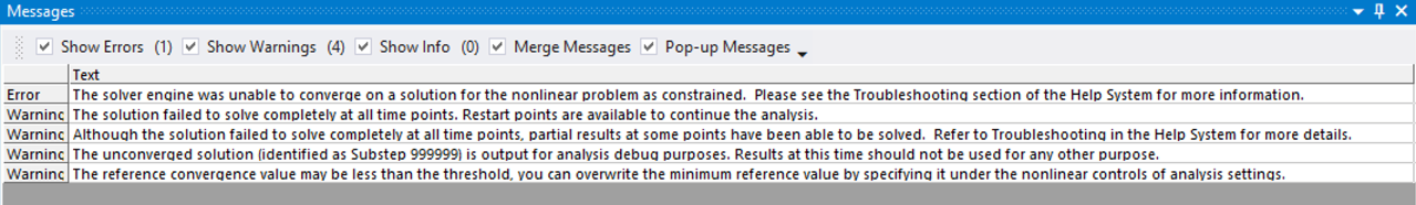 Hi guys I am trying to solve this robotic finger that is cable actuated. I keep engountering convergance issues and multiple errors such as the ones shown. I also keep getting "elapsed time exceeded the CPU time by an excessive margin" as an error. I have included the file and solver output in the google drive. I am not sure if my constraints are correct but it seems to be an issue with my analysis settings. I have also assinged certain angle parameters to the revolute joints to simulate it griping a certain sized object im not sure if this would affect anything when the displacement is applied to the cables. I have been struggling with this for some time and feel i lack the knowledge to complete it so any help would be useful. Heres the link to the google drive Google drive.