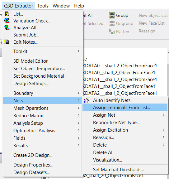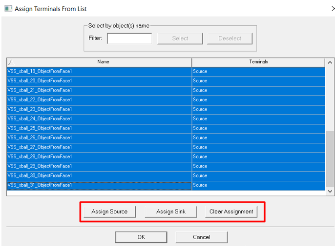 点击Q3D Extractor>> Nets >> Assign Terminals From List,打开source/sink的编辑界面。