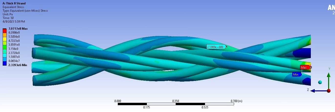 I am modeling a small section of an 8-strand mooring line with a force applied at one end and a fixed support at the other. The issue I am having is a high, unrealistic stress value near the face where the fixed support is applied, I think because of the fixed support. In the real application, there is not a fixed support at this end because it is just a small section of a much bigger line. I have tried both a fixed support and a displacement but both yield the same results ( I now realize that the two constraints do the same thing). The expected stress result should be similar to the probed value. Is there a better way to more accurately constrain this end?