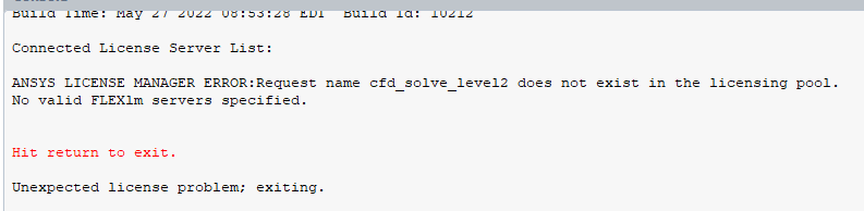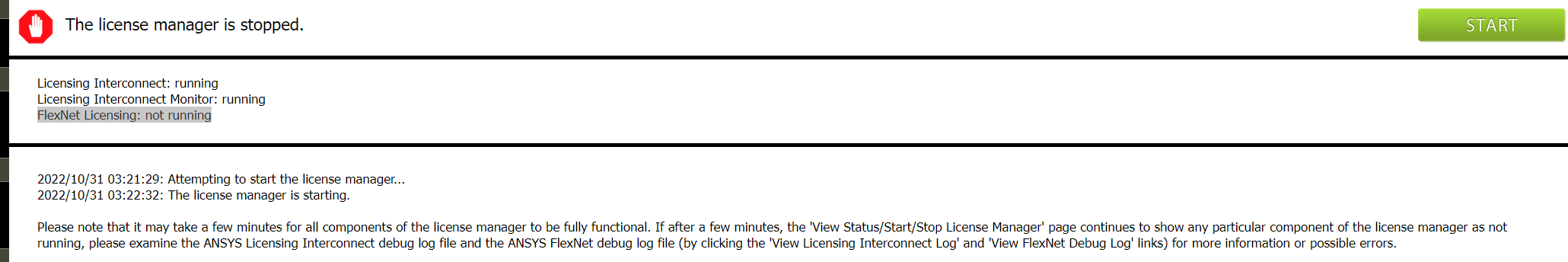 2022/10/31 03:37:39 Â Â INFO Â Â Â Â Â Â Â Â Still trying to start FLEXlm server. Please wait ...2022/10/31 03:37:59 Â Â ERROR Â Â Â Â Â Â Â Failed to start the FLEXlm license manager. Please check the FLEXlm log file E:\Ansys\ANSYS Inc\Shared Files\Licensing\license.log for more information (errno = 0).