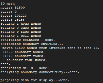 1. I need to make sure the mesh file actually includes volume cells. If the file only contains boundary faces, the adjacency algorithm won’t find interior neighbors. I think thats where the problem is. When i write the mesh there is a console output that says “moved nodes from interior zone to zone 13.”