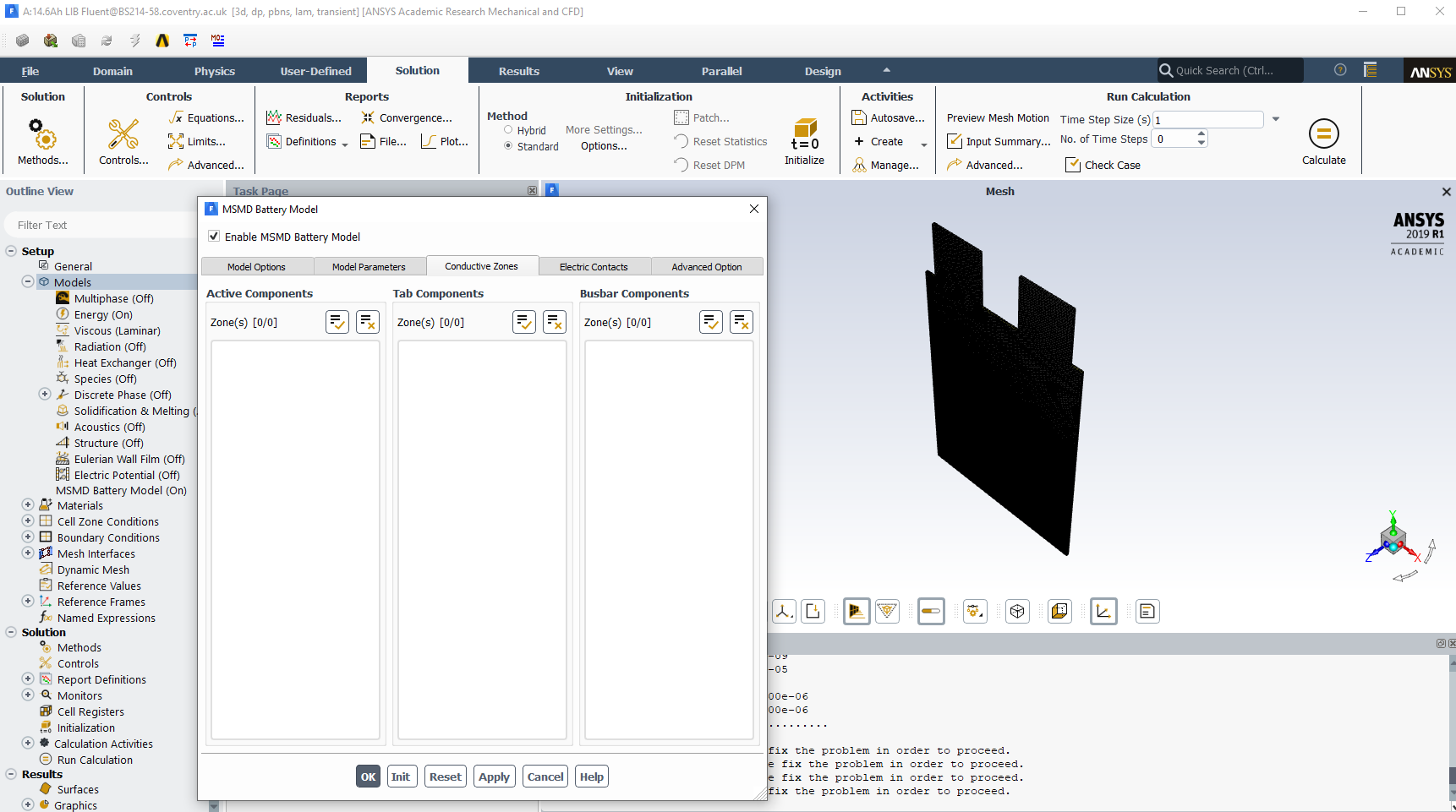 nI wanted to move on and create my own geometry and run the MSMD model again. However, in the tutorial you are given a .msh file which you load into fluent and start setting up the MSMD model parameters. When I create my own geometry, nothing shows up in the conductive zones (as seen in the image). Ive setup my own geometry and the given .msh file to be as similar as possible. I cannot open the .msh file in the fluent meshing software either and the tutorial makes no mention of how the mesh/geometry was setup. The image below is when I create my own geometry and try to setup the MSMD model parameters.n