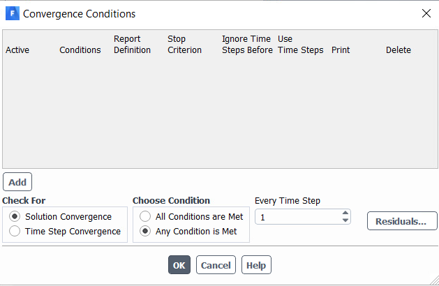SubscriberFrom my very basic understanding of CFD and Fluent, I thought that if I set my residual absolute criteria that once the residuals hit that criteria the simulation would proceed to the next time step. Is that correct? All of my previous simulations working in Fluent have worked that way.
