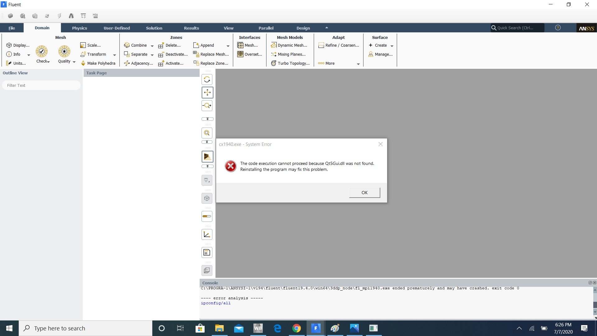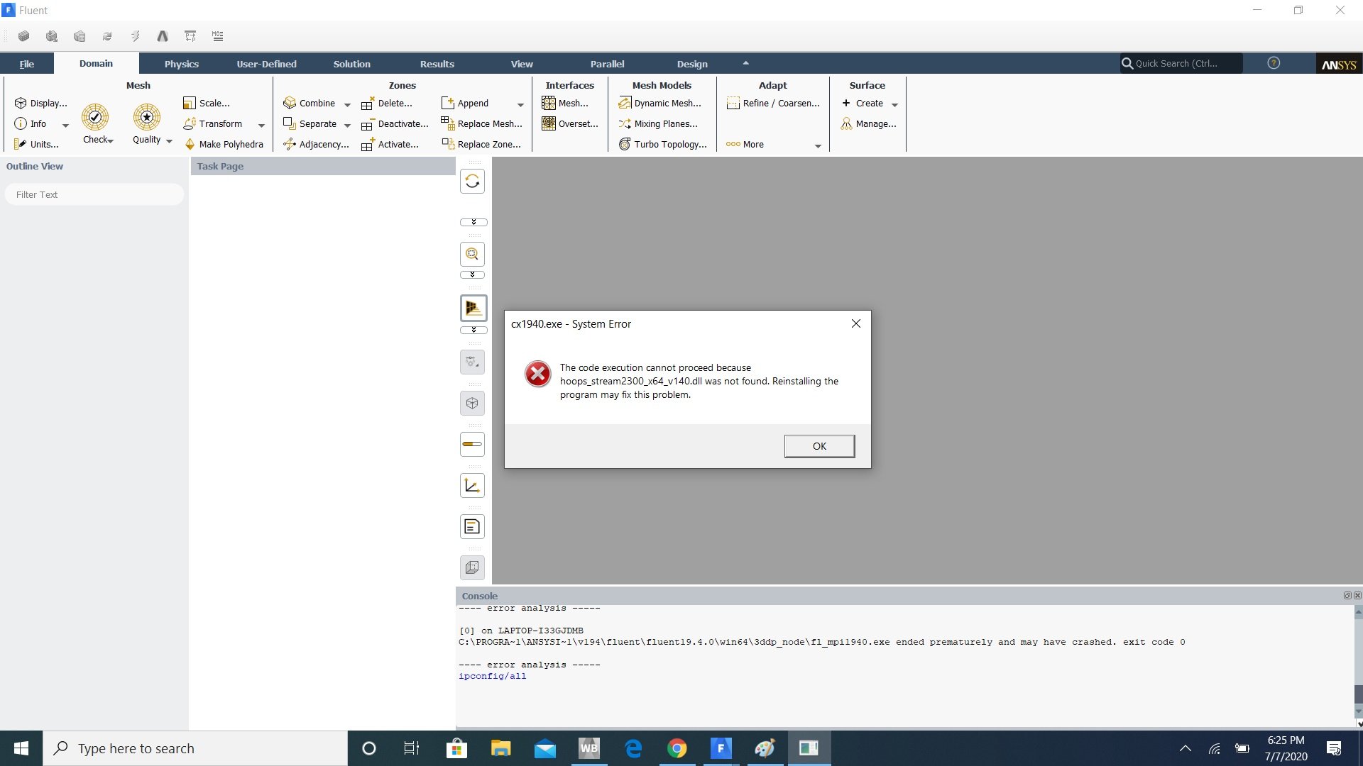 Ansys EmployeeDon't set those MPI and interface. It's a different issue/workaround.nIt seems you can launch stand-alone Fluent but have issue when launching WB-Fluent.nDid you try reinstalling ANSYS ?nTry the following (make sure all ANSYS applications are closed first)n1. Open up Product & CAD Configuration with 'run as administrator' -> Configure Products & CADs -> Select alln2. In the CMD Prompt window, enter the following commandsnset PATH=C:\WINDOWS\system32;C:\WINDOWS;C:\WINDOWS\System32\WbemnC:\Program Files\ANSYS Inc\v194\Framework\bin\Win64\runwb2.exenBefore you try to launch Fluent from Workbench, right click on the 'setup' cell and select properties, then check the box to open up Fluent Launcher when launching Fluent from Workbench. In Fluent Launcher , select Show More Options -> Environment , then type the following in the boxnFLUENT_LAUNCHER_OPTIONS=-driver mswndoes any of these help ?n