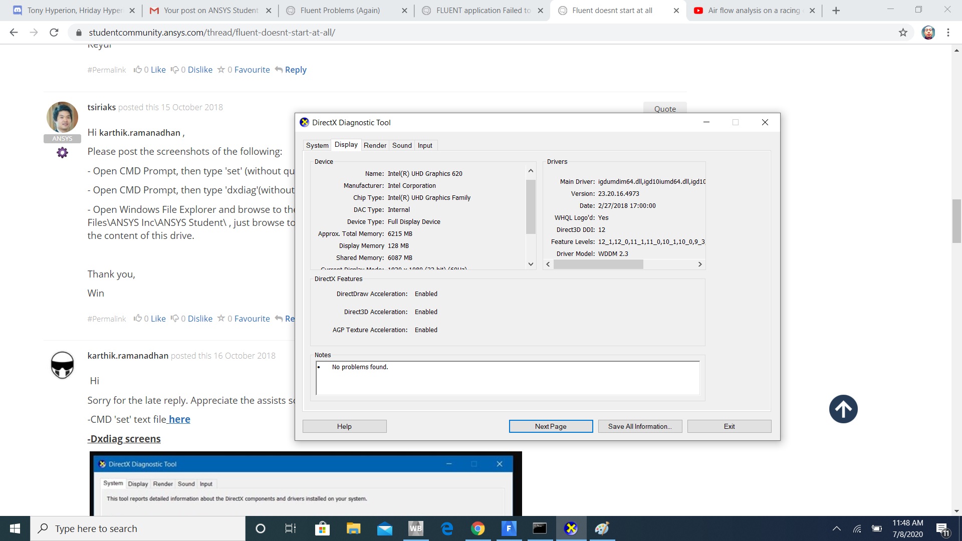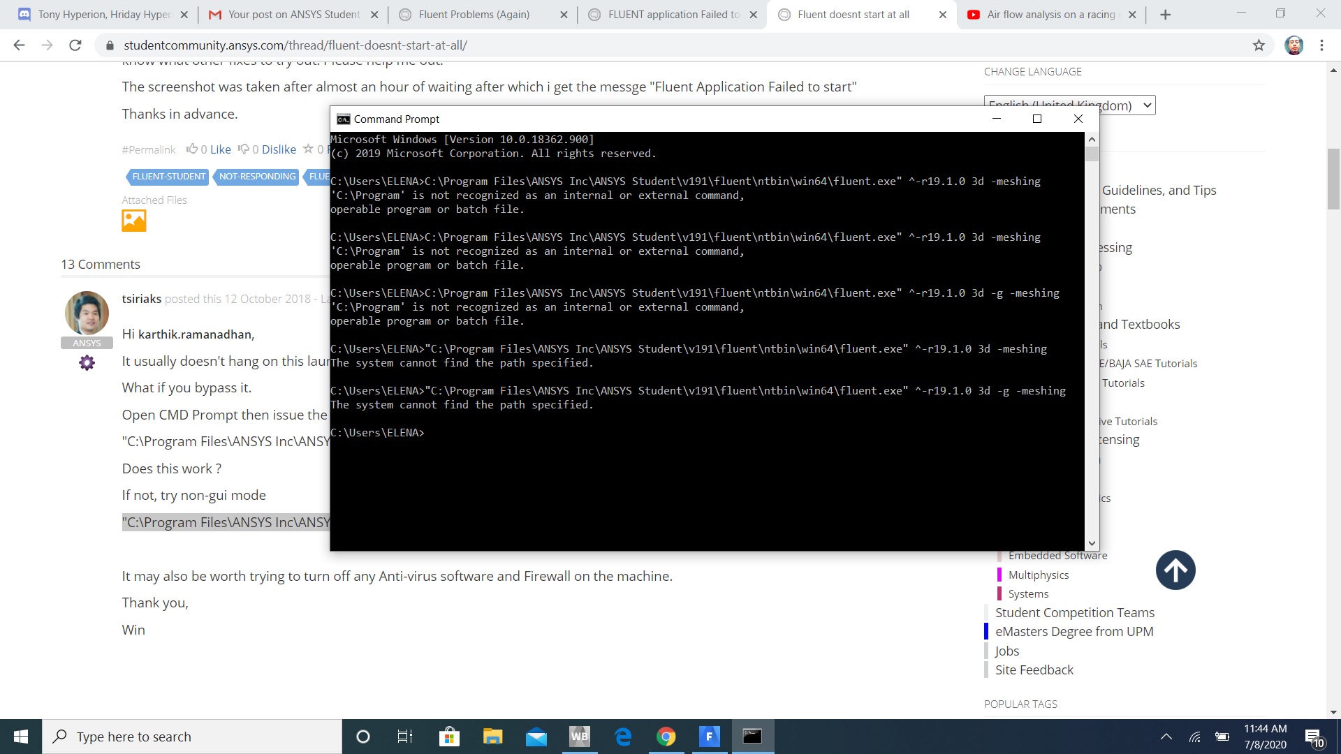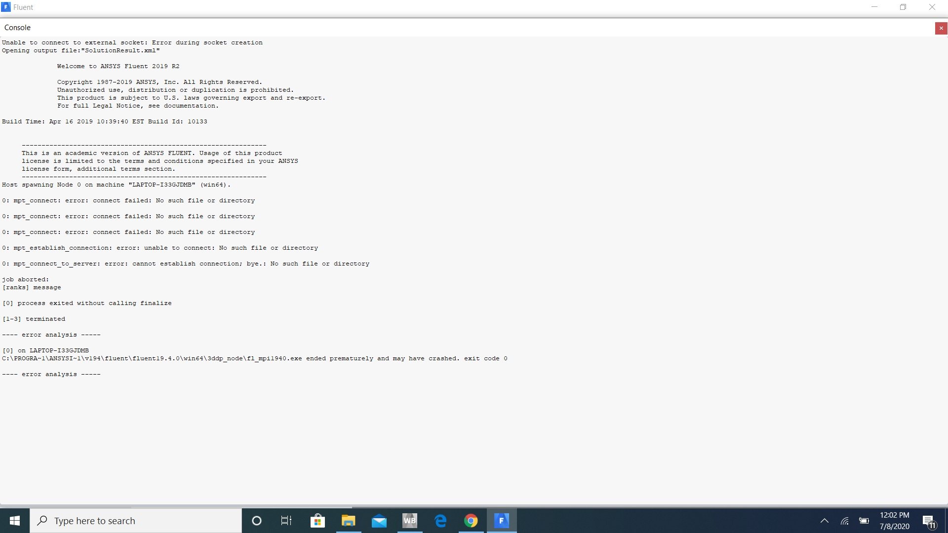 SubscriberI have no idea what is going on with this program... I read the suggested threads:  /forum/forums/topic/fluent-application-failed-to-start/    and   /forum/forums/topic/fluent-doesnt-start-at-all/  but don't really understand what the instructions are... I'm not very good with IT stuff. So I watched a Youtube video https://www.youtube.com/watch?v=9NG3Qc5f68U&t=39s as a guide to upload my Solidworks design and run fluid simulations on it. ANSYS workbench lets me import the IGS file and and do the mesh process too but then when to comes to setup, Fluent fails to start. I also followed the steps in /forum/forums/topic/fluent-19-2-not-working/ but still no success.Â
