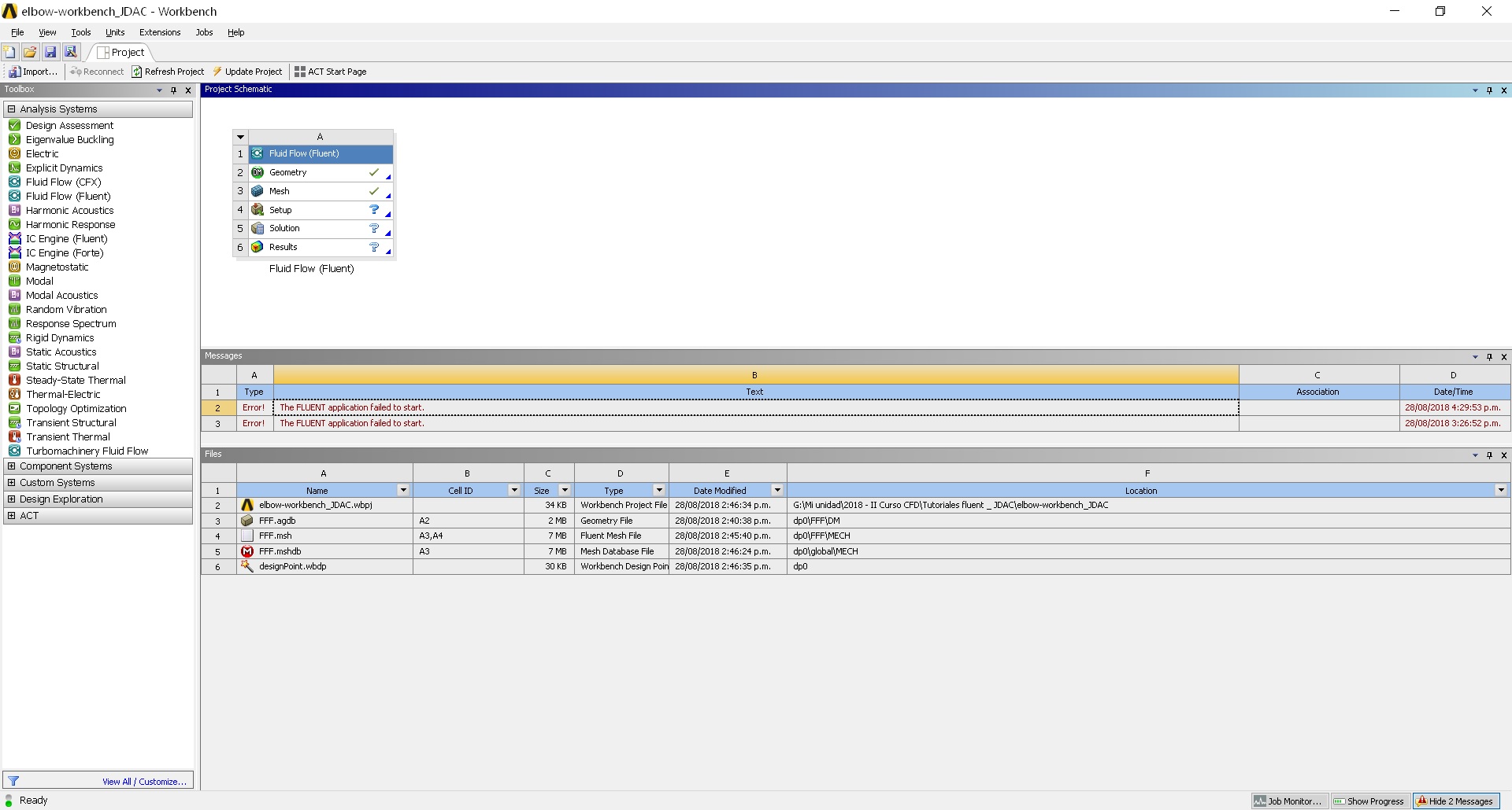 SubscriberGodd afternoon. I have a similar problem. I'm trying to run a fluent tutorial (Spicifically the heat transfer in a mixing elbow). I have done the elbow's geometry and meshi according to the tutorial, but, when I open the workbench's setup Ansys returns me the message :