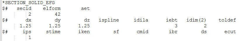 Moreover, Are there any specific reasons you set IAT1-3 to 1 in *CONTROL_REMESHING_EFG? These are higher than the recommended values in the manual. Lower values may help prevent mesh distortion and negative element volume error.