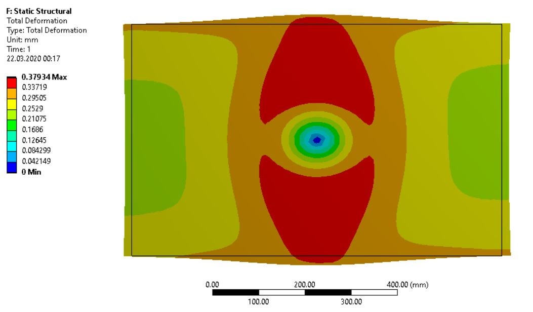In an experimental setup I would like to lay this plate on the floor without clamping and heat it in the middle to about 760°C. Because of the local heat input and the non-symmetrical geometry, elastic/plastic stresses and deformations build up. How can I reproduce this free support on the floor in a digital environment? I tried it with remote displacement but i'm not sure if this is the right approach. I expected a symmetrical deformation.