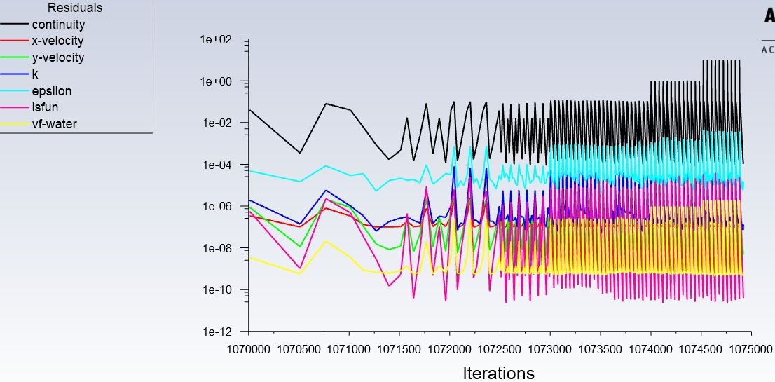 The final residuals are shown in the figure below.  As for solver settings: we are using VOF-2 phase (surface tension = 0.072 N/m); realizable k-epsilon, SIMPLE or SIMPLEC scheme, 2nd order upwind scheme.   -Best, Tao