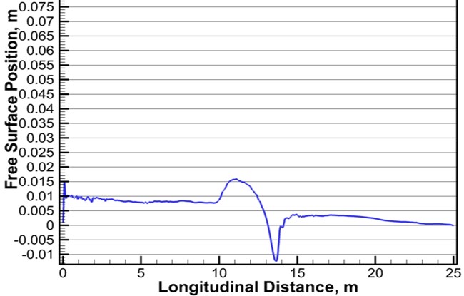 jumps/oscillations gradually settle down further downstream. Below is a free surface plot, for a