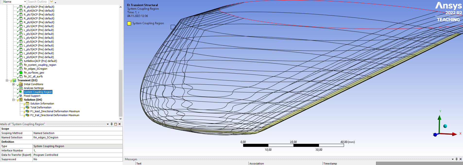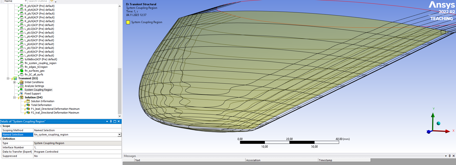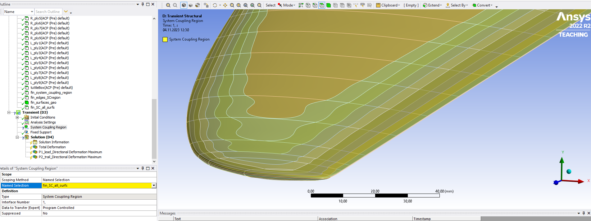 I am encountering a very strange ?bug? during the preprocessing stage of FSI simulations. My wing is cut into surfaces, which are used in ACP to assign different composite lay up properties. I have CFD (Fluent) and FEM (Mechanical) models prepared and working well separately. To achive coupling I have to define system coupling region in mechanical, where the problem is as follows: