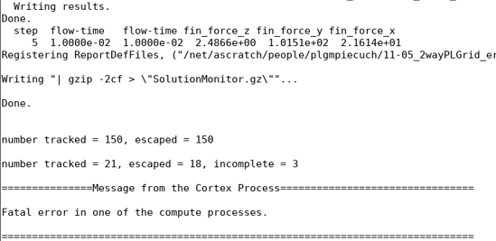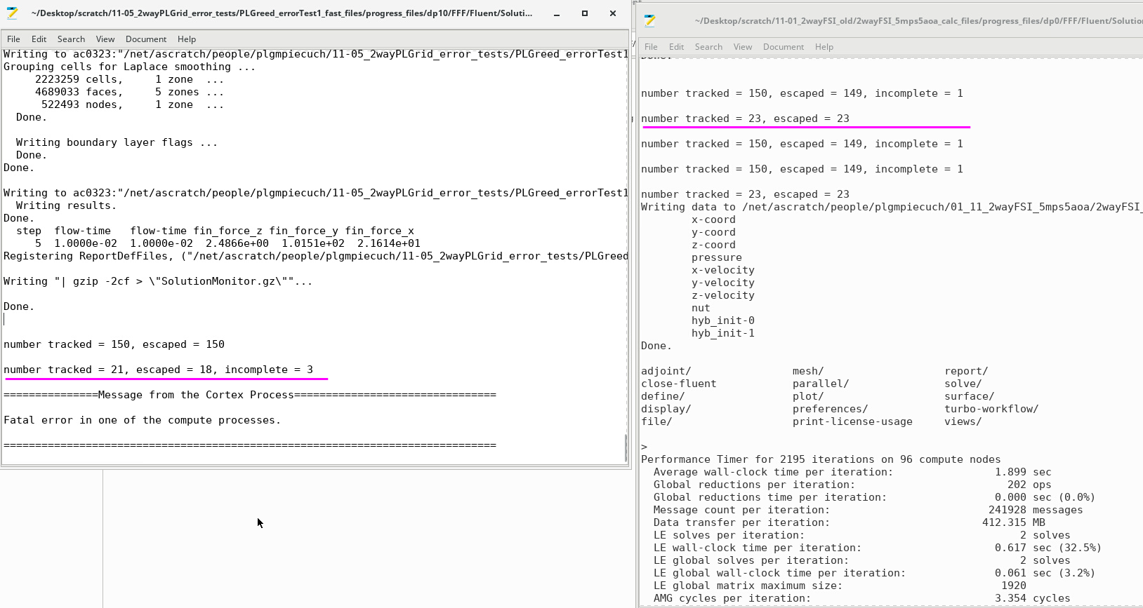 Please check my attached logs. On the left is log from current project which fails, on the right is one from the past which I use for comparison. This is the fluent solution.trn log part after calculations informing about writing results etc. Can you tell me what is this “number tracked” and what could cause the problem?