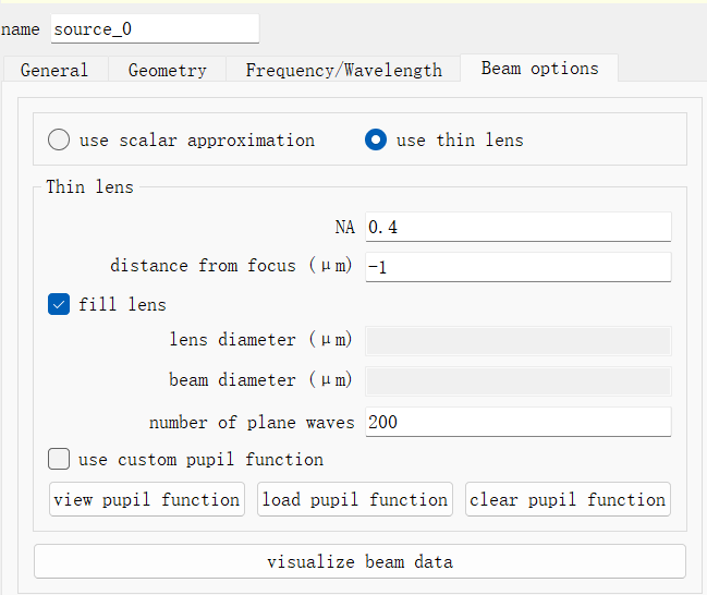 3.如果不选“fill lens”的话就要输入透镜直径和光束直径,这里的光束直径指的是束腰直径吗?
